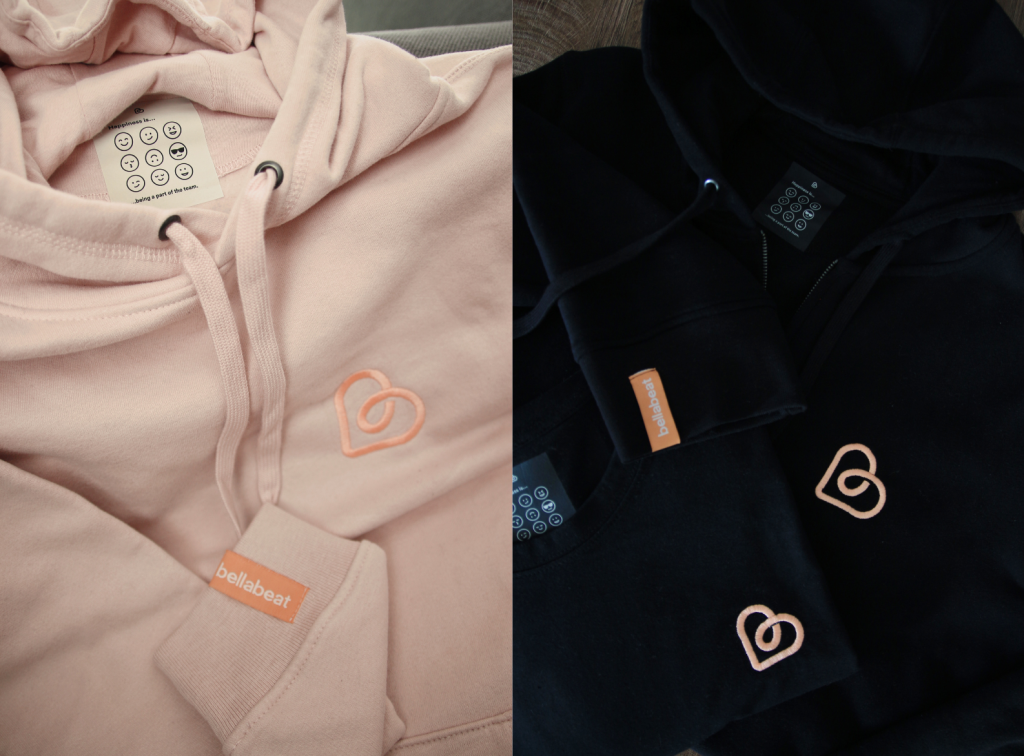 Bellabeat, a startup specializing in so-called smart jewelry, chose powder blue and black hoodies for their team with a few personalized details.