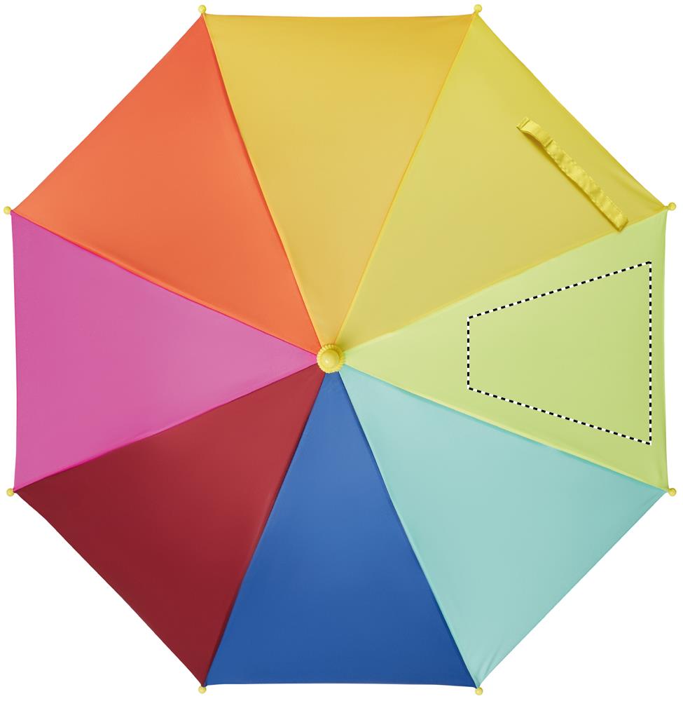 18 inch kids umbrella in 190T pongee with rainbow pattern. It has 8 panels. Manual opening and closure. Fibreglass ribs and frame. Plastic handle and tips. Curved handle.