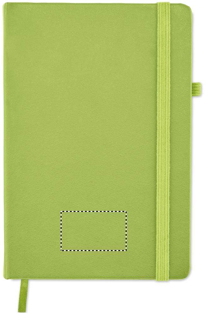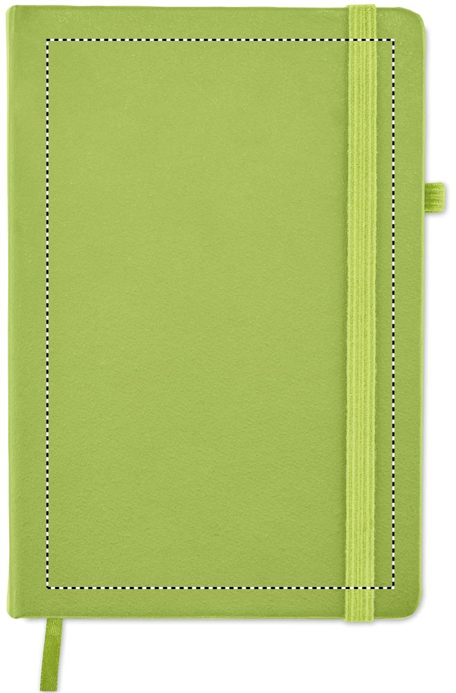 A5 notebook with 70% recycled pre-consumer leather and 30% latex PU cover. Casebound. 192 lined pages recycled paper (96 sheets). Matching cotton elastic closure strap and pen holder.
