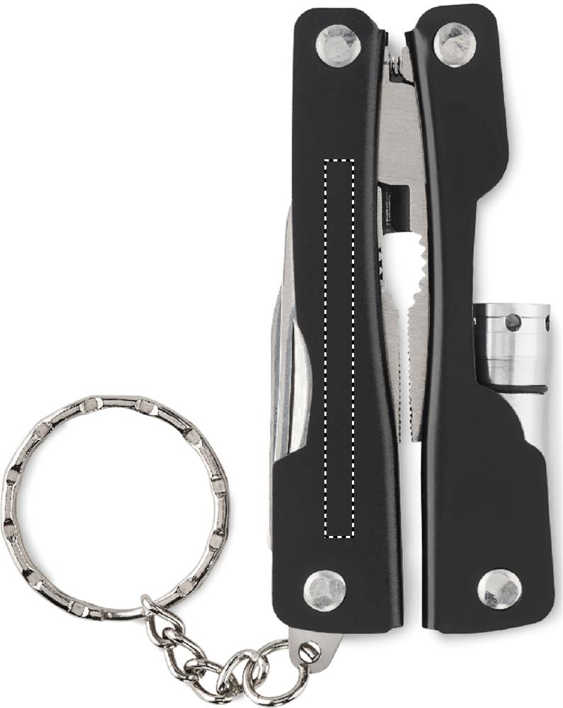 Foldable multi-tool knife with flashlight in stainless steel. Includes 10 tool functions including 600D polyester pouch. Including 3 x AG3 button cells.