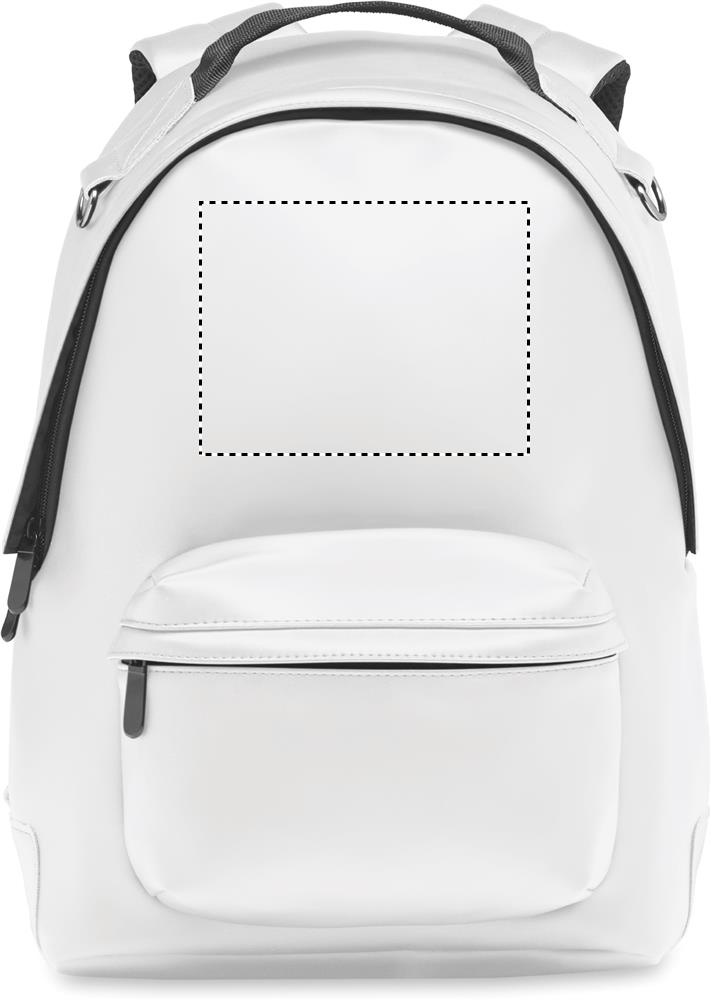 15 inch laptop backpack in soft PU with padded back and reinforced base. Front zipped pocket. The lining is 210D RPET.