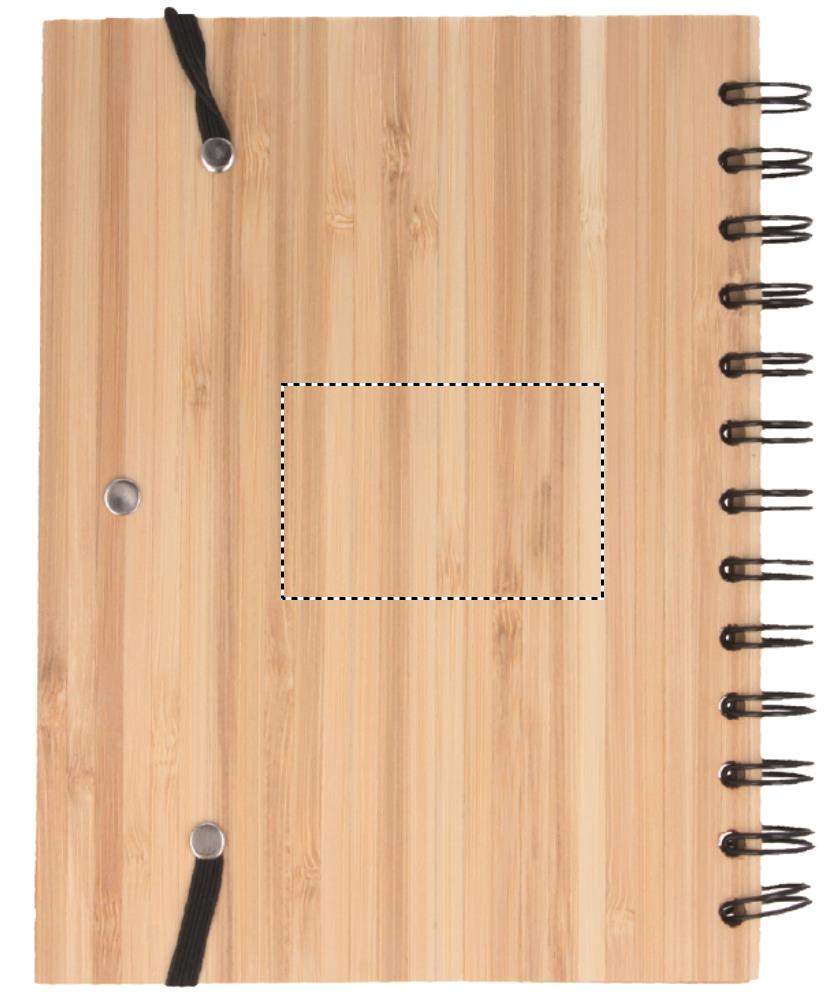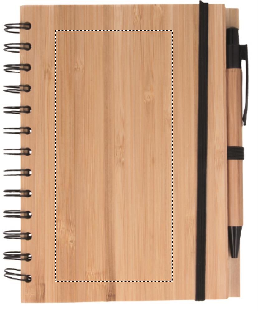 Bamboo cover notebook with matching pen. Twin-wire. 140 lined recycled paper pages (70 sheets). Matching push button ball pen with bamboo barrel and ABS details. Elastic pen holder. Bamboo is a natural product, there may be slight variations in colour and size per item, which can affect the final decoration outcome. FSC®-certified | FSC 100%, N5.7, FSC-C213206