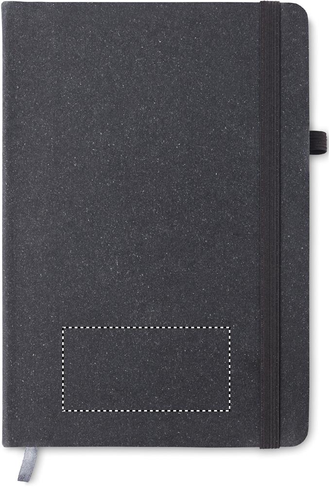A5 notebook with 70% recycled pre-consumer leather and 30% latex PU cover. Casebound. 160 lined pages recycled paper (80 sheets). Matching elastic closure strap and pen holder.