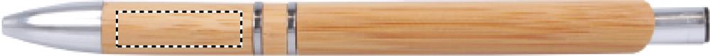 Push button pen in aluminium fittings with bamboo barrel. Blue ink. Bamboo is a natural product, there may be slight variations in colour and size per item, which can affect the final decoration outcome.