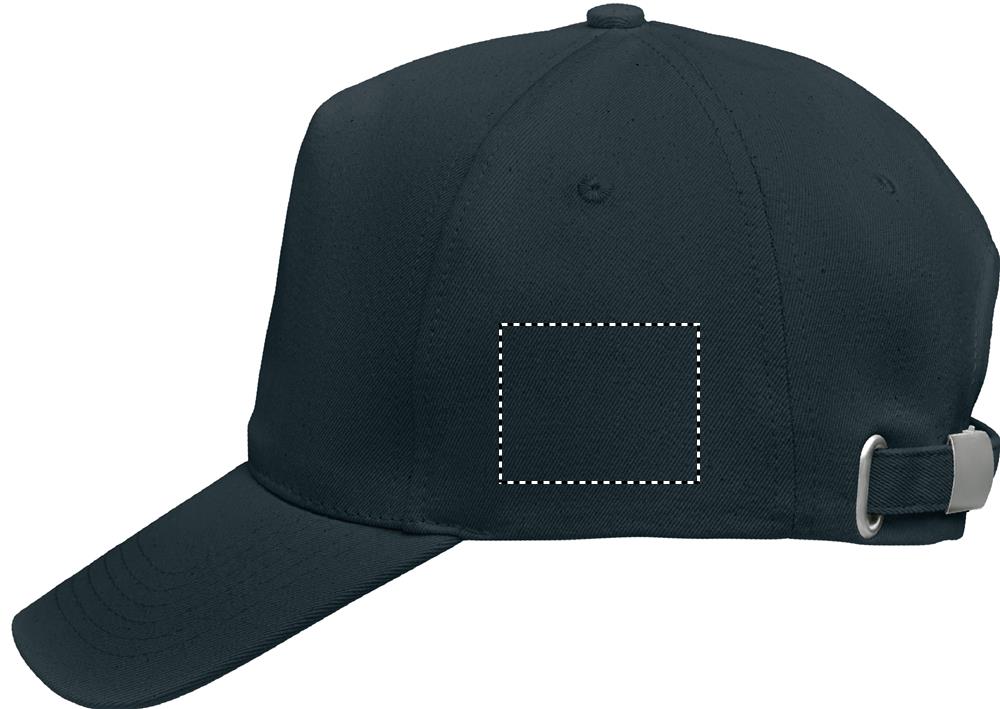 5 panel baseball cap in 250 gr/m² organic brushed cotton with metal adjustable strap back buckle closure.