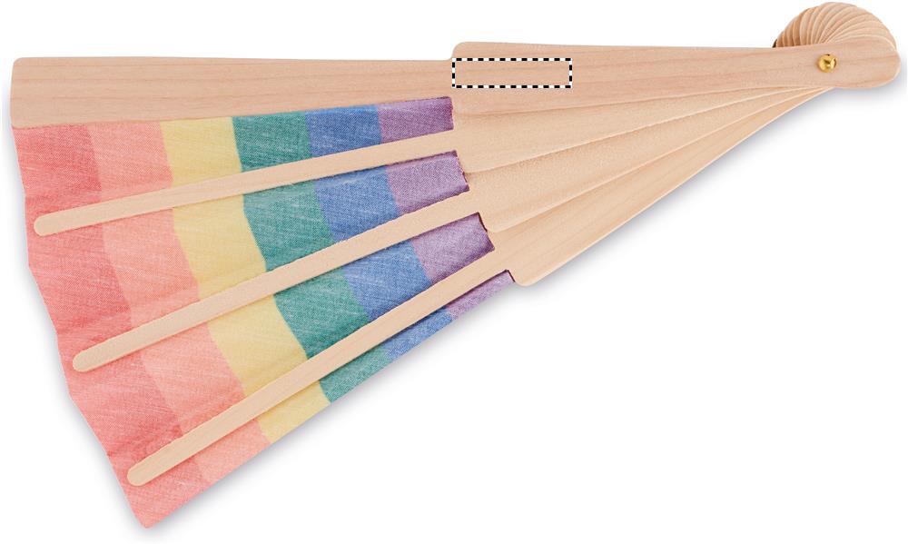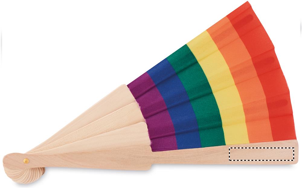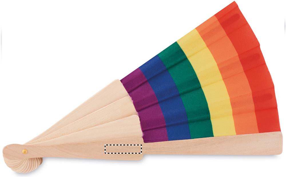 Manual hand fan in wood and polyester fabric with rainbow pattern.