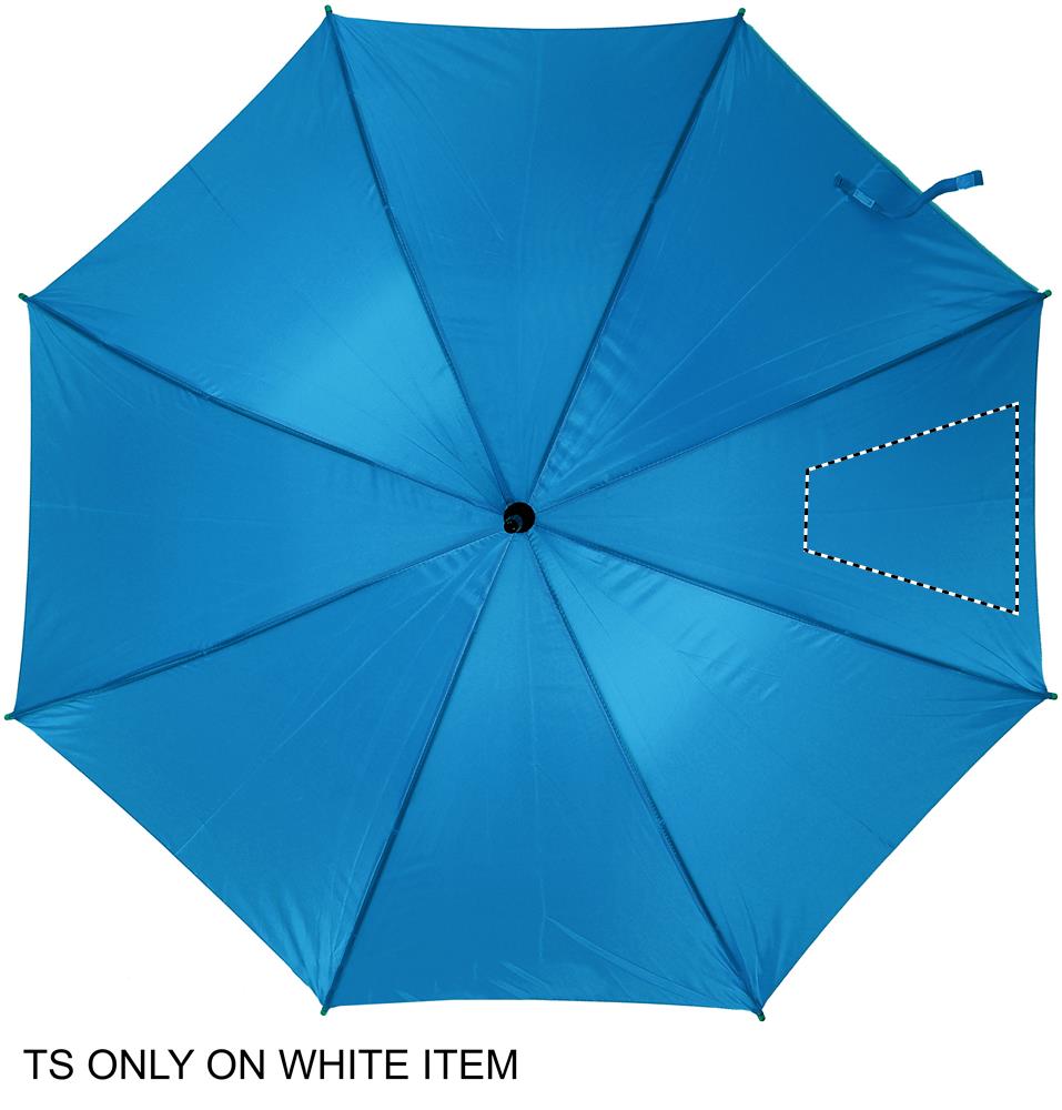 23 inch manual open umbrella in 190T polyester with wooden shaft, tips and top. Black plating metal ribs. Curved wooden handle. Wood in natural finish. Manual closure.