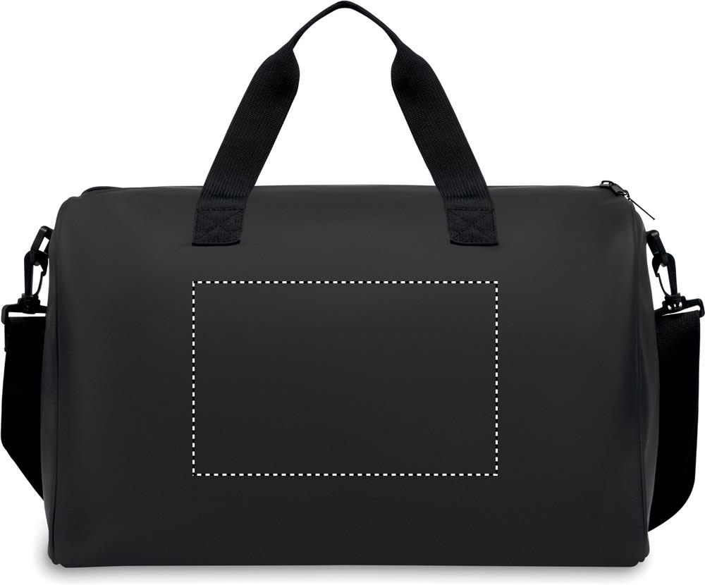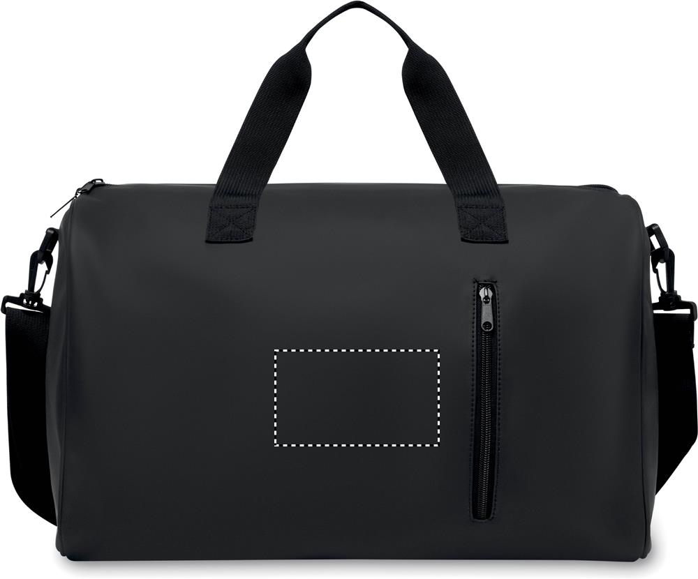 Duffle bag in soft PU with foam reinforcement to the base. One main compartment, zippered front pocket. 210D RPET polyester lining. 2 handles and one adjustable and detachable shoulder strap