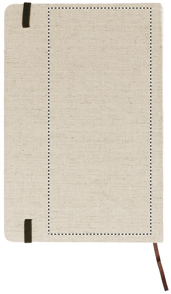 A5 notebook with hard canvas cover. Casebound. 192 lined recycled paper pages (96 sheets). Contrasting elastic closure strap and ribbon page-marker.
