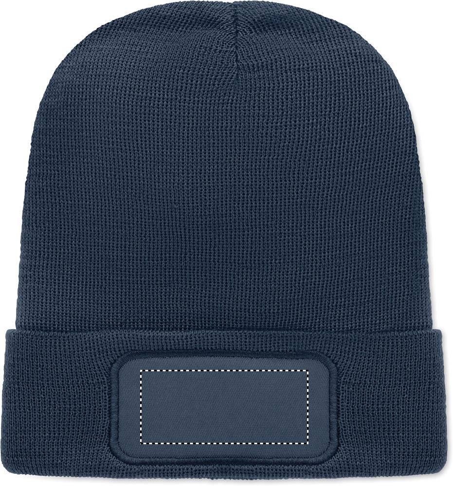Unisex knitted beanie in soft stretchable RPET polyester with cuff and patch.