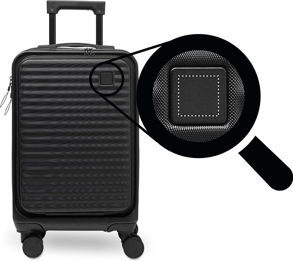 20 inch hard-shell trolley in ABS. 1 main compartment with inner compartment. Additional front zippered compartment for documents and padded 15” laptop compartment. Includes a security lock (TSA). Rides on 4 wheels.