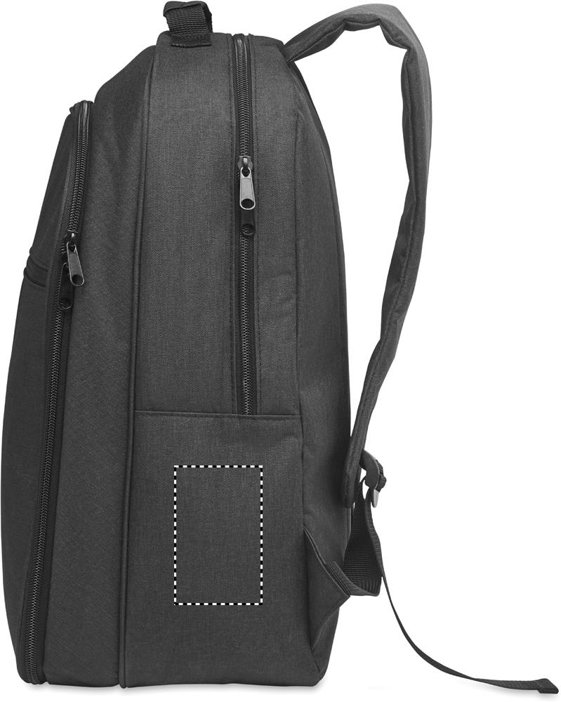 300D RPET cooling backpack with 15 inch laptop compartment. Front zipper pocket and one side mesh compartment.