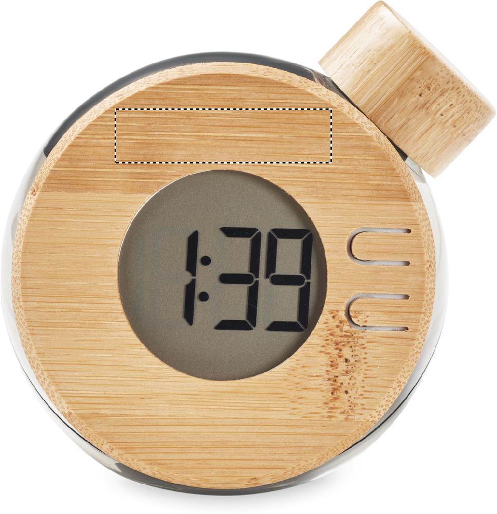 Large display LCD clock with bamboo details. To power this product, only add water and 3gr salt. 1 LR41 battery included for memory purposes. Bamboo is a natural product, there may be slight variations in colour and size per item, which can affect the final decoration outcome.