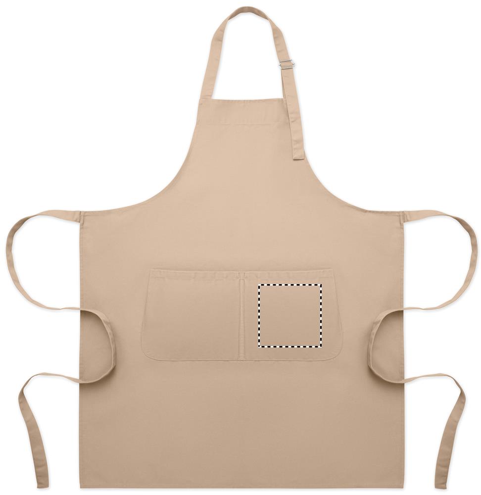 Long adjustable kitchen apron in 240 gr/m² polycotton (35% cotton, 65% polyester) with two front pockets and adjustable strap with metal buckle.