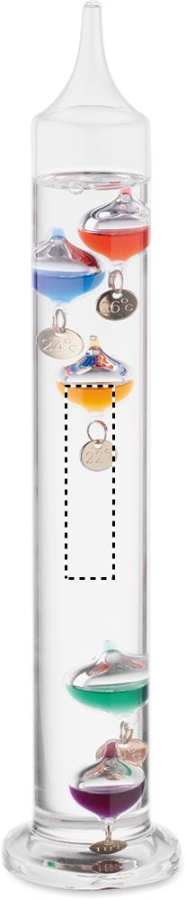 Galileo thermometer in glass with five coloured floating globes and wooden base. Each globe indicates the temperature from 18°c to 26°: Red 26°, Royal Blue 24°, Orange 22°, Green 20°and Purple 18°. The lowest sphere in the top group indicates ambient temperature.