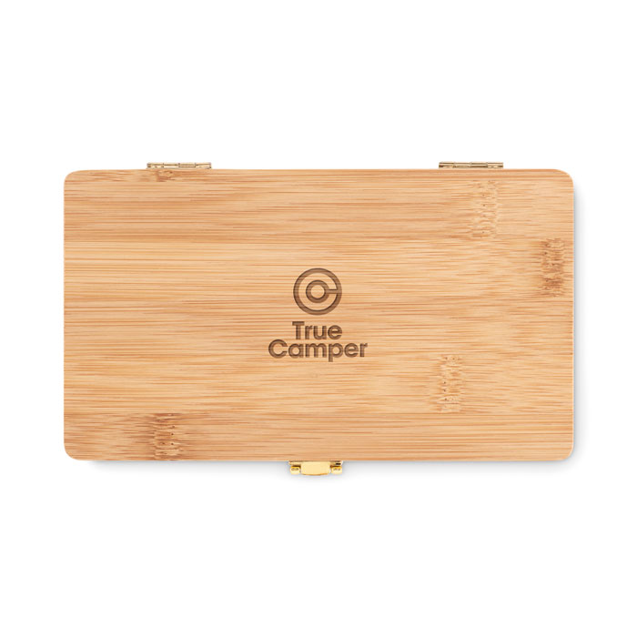 Handy 21 pieces tool set presented in a natural looking bamboo case. The perfect gift for a DIY handyman or amateur carpenter. This useful box has all the essential tools one should have in their home in case repairs are needed or small projects come up. It contains 3 screwdrivers, 10 bits in holder, 3 slotted sizes, 3 Torx sizes and 1 adapter, 4 sockets , 1pc cutter, 1 handle and 1 connector. Bamboo is a natural product, there may be slight variations in colour and size per item, which can affect the final decoration outcome. Box size 19 ,5×11,8×3 cm. FSC®-certified | FSC 100%, N5.7, FSC-C213206