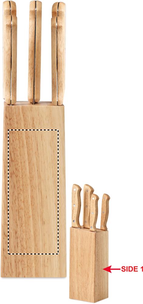 Wooden knife set. Includes base holder and 5 knives: Chef, bread, slicing, multi-functional and paring. Stainless steel with wooden handle.