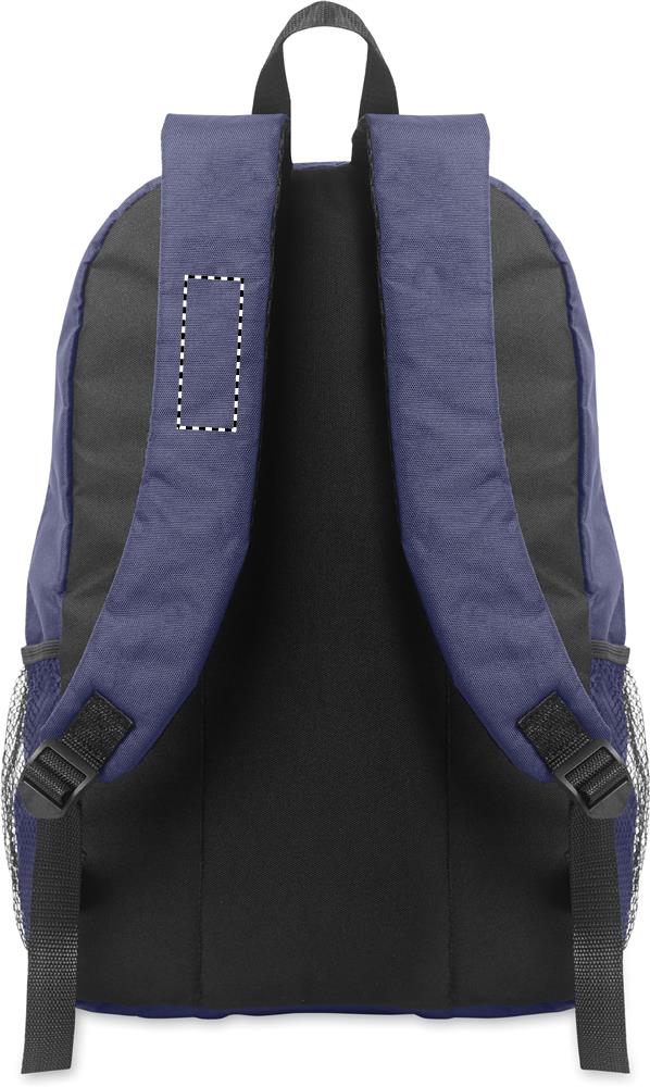 Backpack in 600D RPET polyester with decorating cord and front zippered pocket panel. Mesh pockets on both sides.