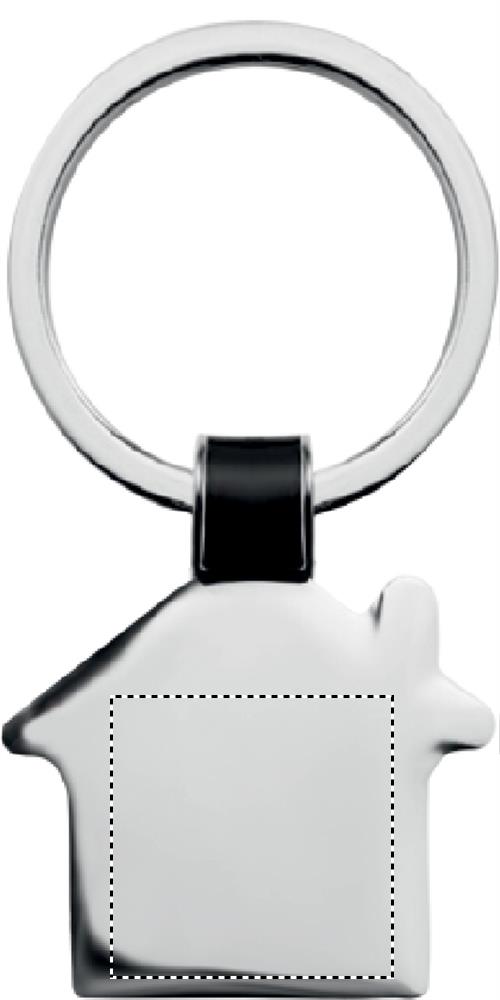 House shaped metal key ring, shiny nickel finish.