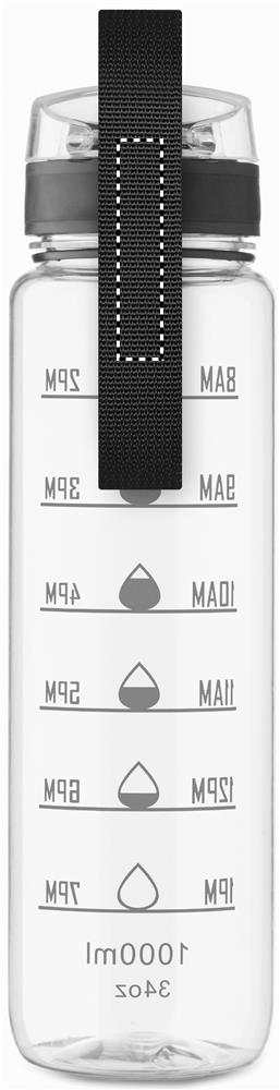Sports water bottle in RPET, motivational time markings, one hand opening flip top lid, safety lock and carrying strap. Leak-free. Capacity: 1L.