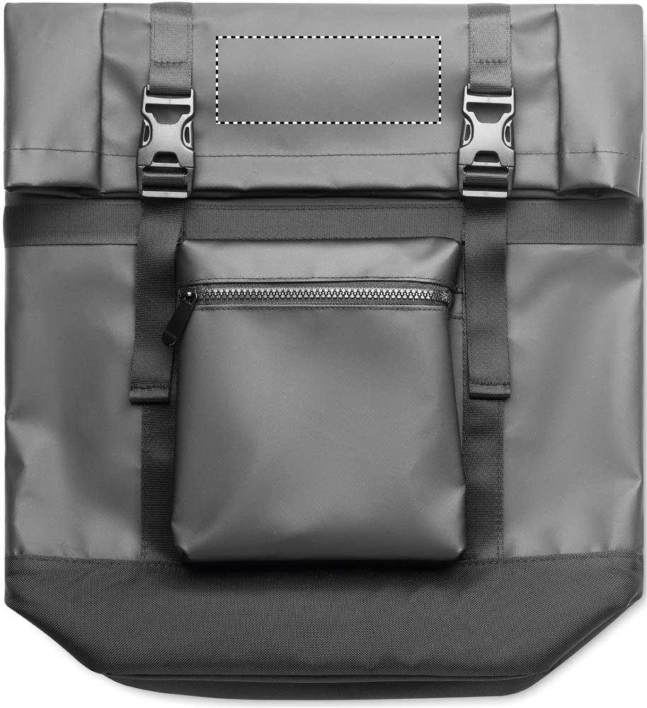 Rolltop backpack in 50C tarpaulin with padded back, base and shoulder straps reinforcement. Front zippered pockets.
