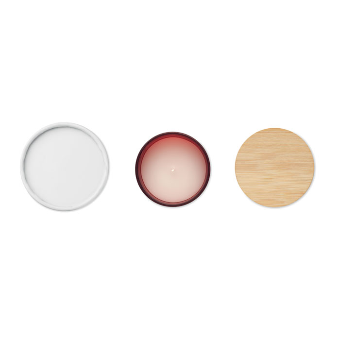 Fragranced plant based wax candle in frosted glass jar holder with bamboo lid. 280 gr. Burn time: 46 hours. Presented in a paper tube gift box. Bamboo is a natural product, there may be slight variations in colour and size per item, which can affect the final decoration outcome.