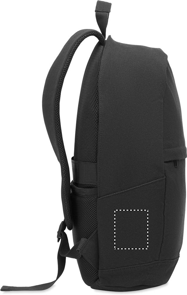 15 inch laptop backpack in recycled pre-consumer cotton and recycled polyester (70%/30%). It has front zippered pocket, zippered pocket on the back side. Soft padded back and shoulder straps. Trolley holder on reverse side.
