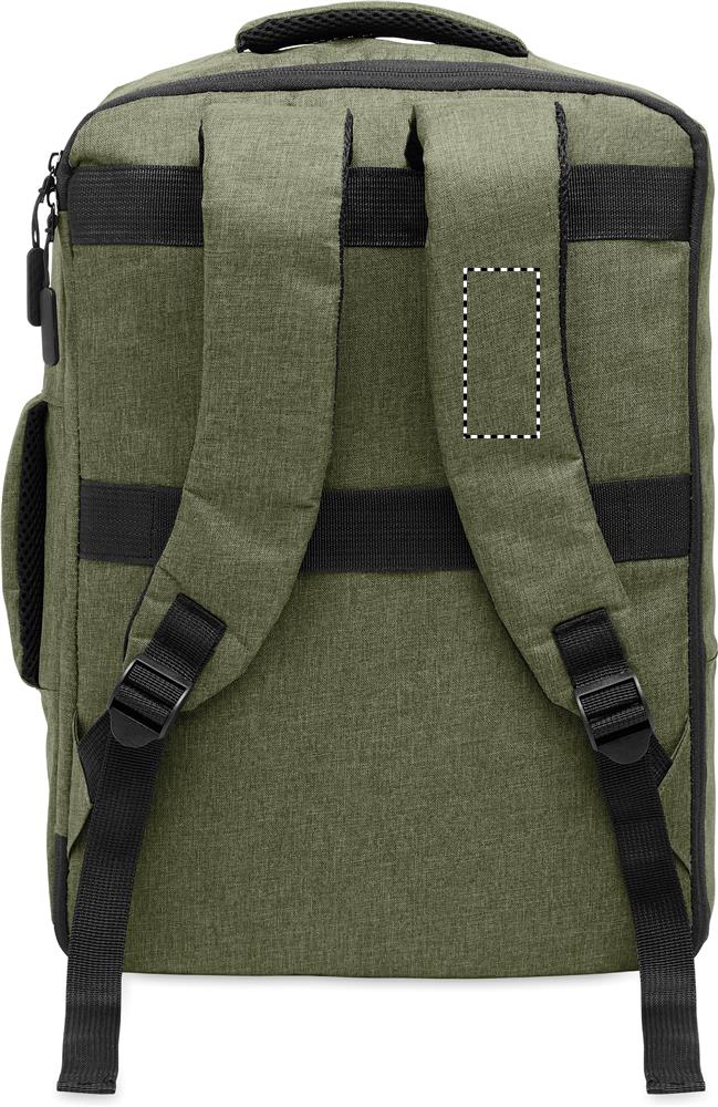 Slim 15 inch laptop backpack in 300D RPET with safe 180 degree opening with 210D RPET lining. Includes laptop compartment, 2 internal slip pockets, 2 internal pen pockets and 2 padded carry handles. Soft padded back and shoulder straps. Suitcase sleeve.