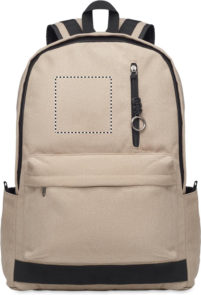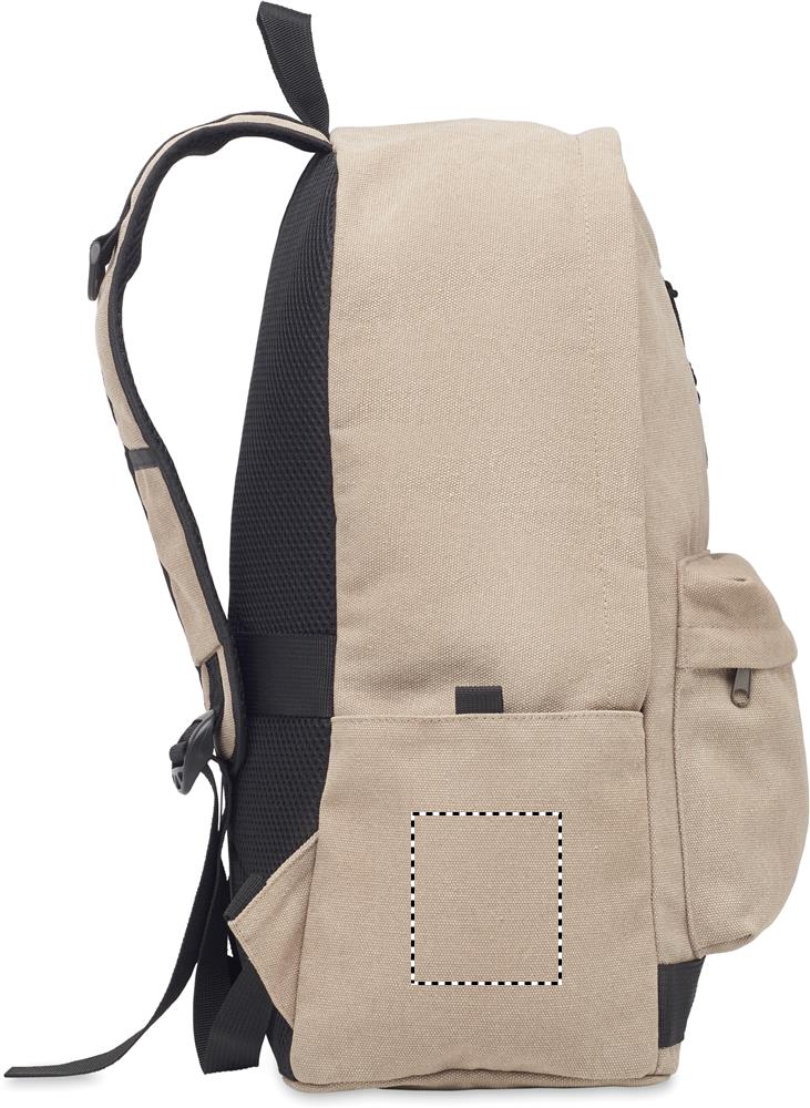 15inch laptop backpack in recycled washed canvas. Large front zippered pocket with inner laptop compartment. Small front zippered pocket. Two side-slip pockets. Padded back and shoulder straps, back panel and base. 450 gr/m².