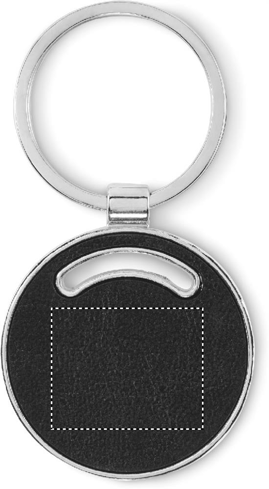 Round shaped metal key ring with recycled PU leather inlay.