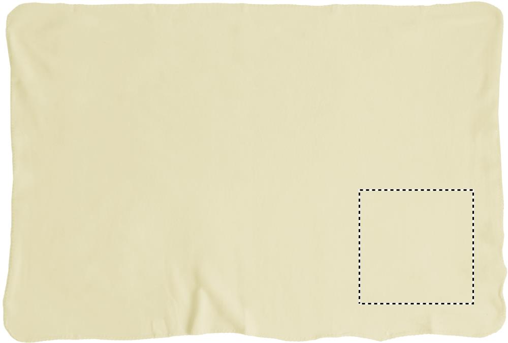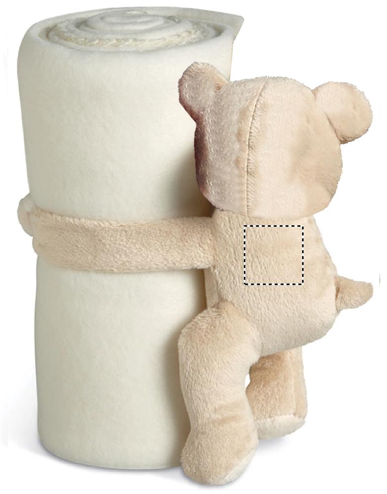 Children’s fleece blanket with teddy bear toy holding the blanket with fastening tape hands.
