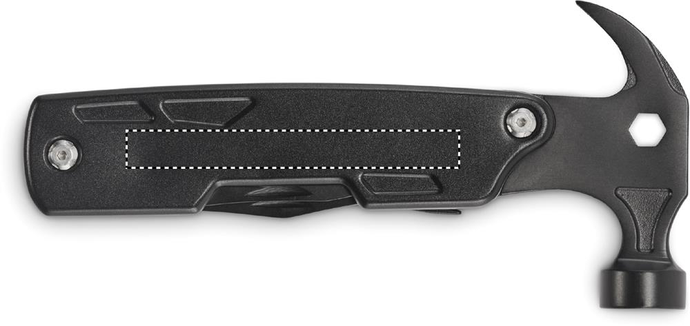 14-in-1 stainless steel multi tool hammer. With nail puller, hex wrench, serrated knife, steel file, variety of screwdrivers, regular pliers, needle-nose pliers, bottle opener, knife, wire cutter.