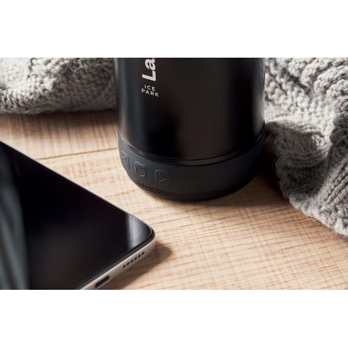 Double wall vacuum insulating bottle in recycled stainless steel (90% recycled stainless steel and 10% stainless steel) and silicone carry handle with detachable 3W wireless speaker. Capacity: 500 ml. 500 mAh battery. Remove speaker for cleaning. Leak-free.