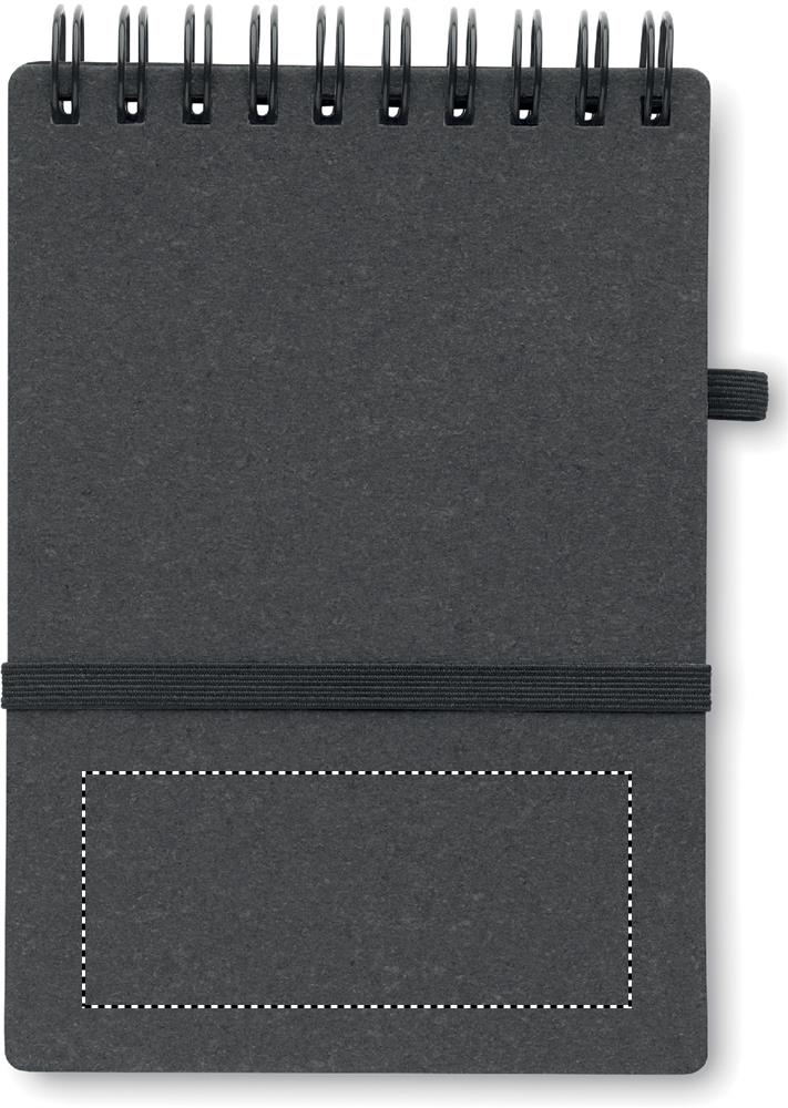 Recycled paper and PU cover (70% recycled paper and 30% PU) notebook. Twin-wire. 140 lined recycled paper pages (70 sheets). Matching push button ball pen in recycled carton and ABS parts. Blue ink. Elastic closure strap and pen holder. FSC®-certified | FSC MIX CREDIT, P7.1, FSC-C213206