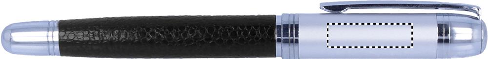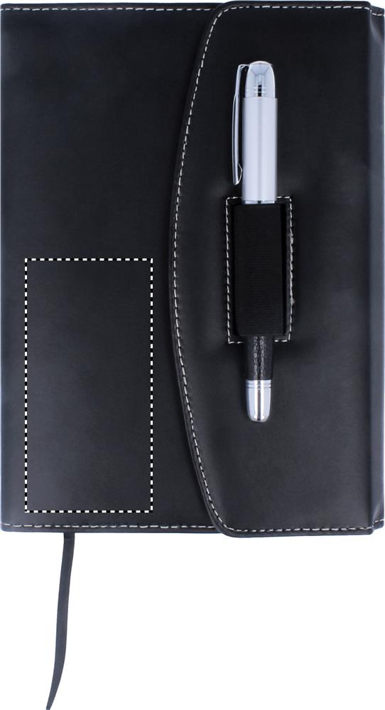 A5 PU notebook portfolio with contrast stiching and pen. 240 lined pages (120 sheets). Matching metal pen. Black ink.