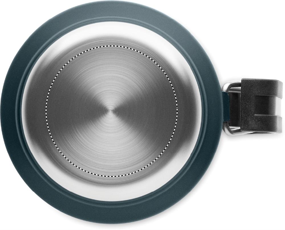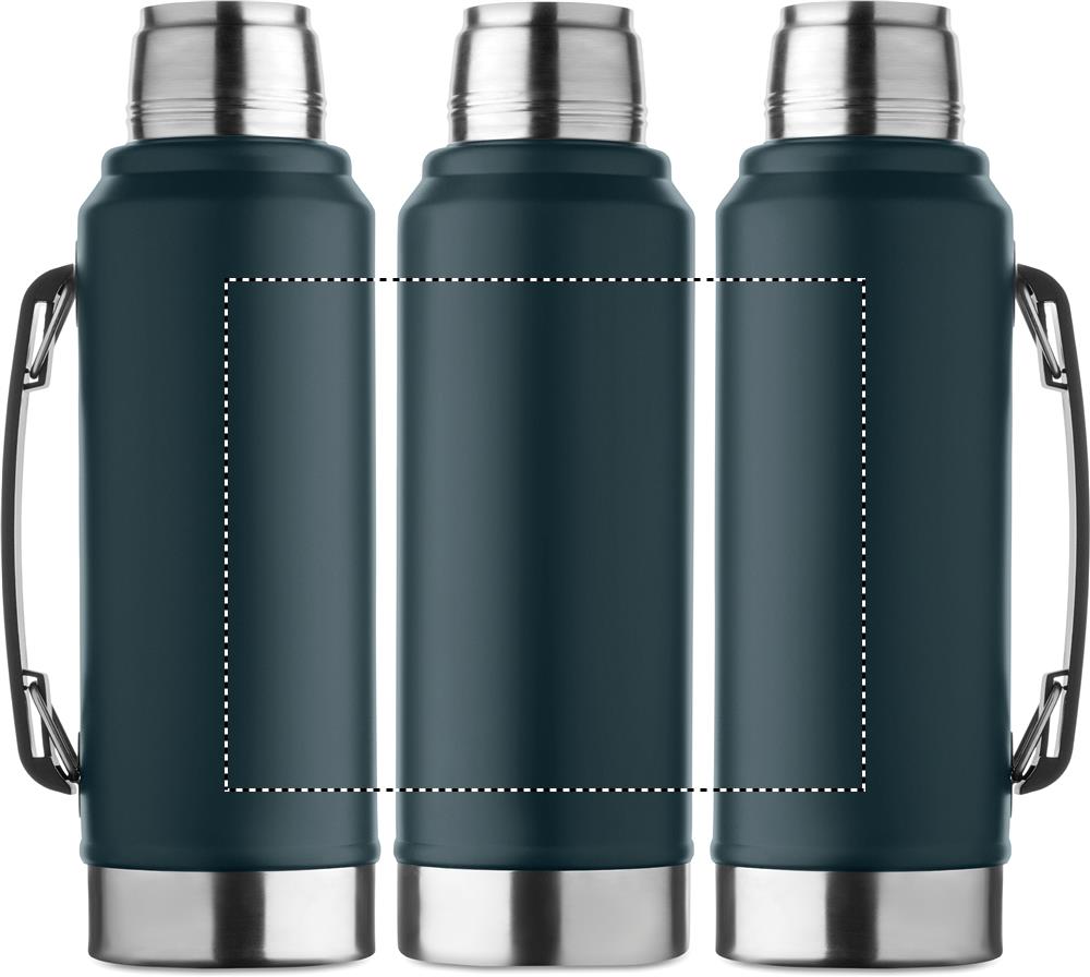Double wall vacuum insulating bottle in recycled stainless steel (90% recycled stainless steel and 10% stainless steel) with handle on side. With PP lid and recycled stainless steel cup. Leak-free. Capacity: 1L.