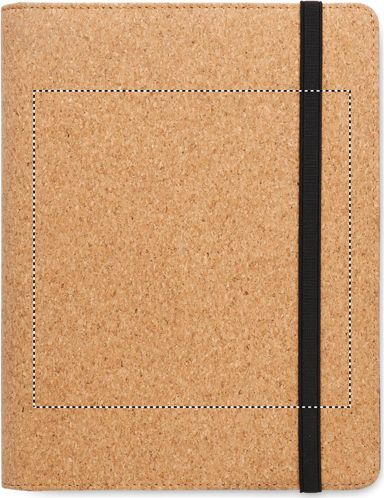 A5 cork portfolio. Refillable A5 notebook with hard cork cover. Casebound. 192 recycled paper lined pages (96 sheets). Matching pen and pen holder. 2 card holders and one large compartment. Elastic closure strap.
