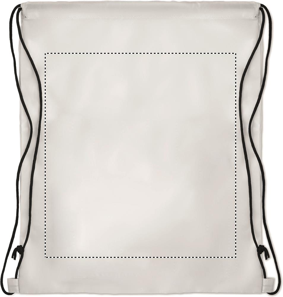 Large drawstring bag in 210D polyester with zippered front pocket.