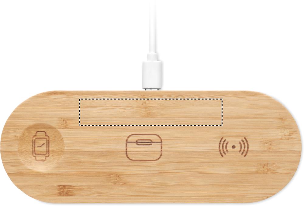 3 in 1 charging station in bamboo case. It includes a wireless charger 15W, smartwatch charger (Apple® only) and TWS charger.