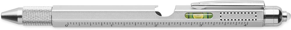 Twist action spirit level pen in stainless steel with ruler, stylus and Phillips head and flat head screw driver bits and LED. 3 AG batteries included. Blue ink.
