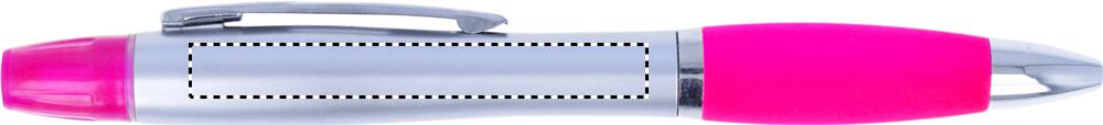 2 in 1 plastic ball pen and highlighter in silver satin finish and chromed fittings. Blue ink.