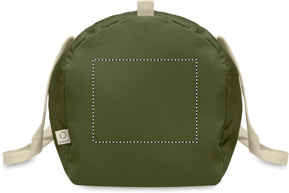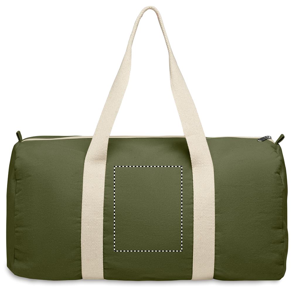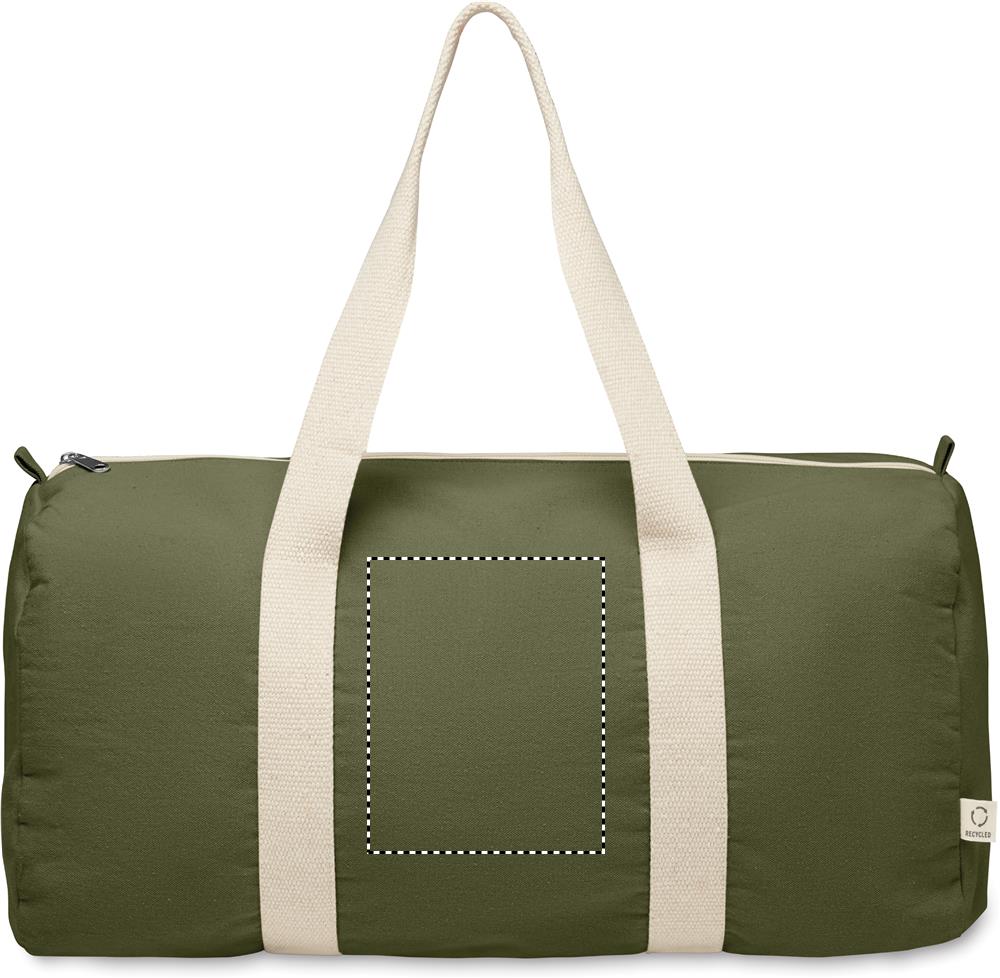 Duffle, sports or travel bag with zippered side compartment and zippered inner pocket in 320 gr/m² recycled cotton (80%) and recycled polyester (20%) with long handles.