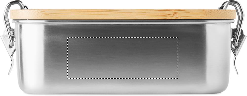 Stainless steel lunch box with side closure buckles and bamboo lid. Capacity: 750 ml. Bamboo is a natural product, there may be slight variations in colour and size per item, which can affect the final decoration outcome.