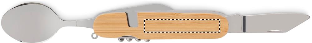 Metal multi-function folding camping cutlery set in wooden casing. 5 functions. Includes fork, spoon, can opener, wine opener and knife. You can separate the pieces in 2.