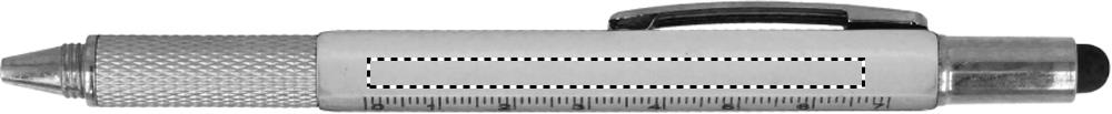 Twist action spirit level pen in ABS with ruler, stylus and phillips head and flat head screw driver bits. Black ink.