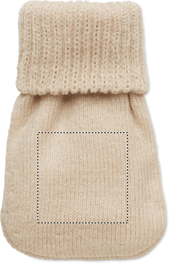 Hand warmer in knitted polyester. Includes instant heat pad in PVC to be activated by pressing the metal plate inside. Reusable by placing pad in hot water.